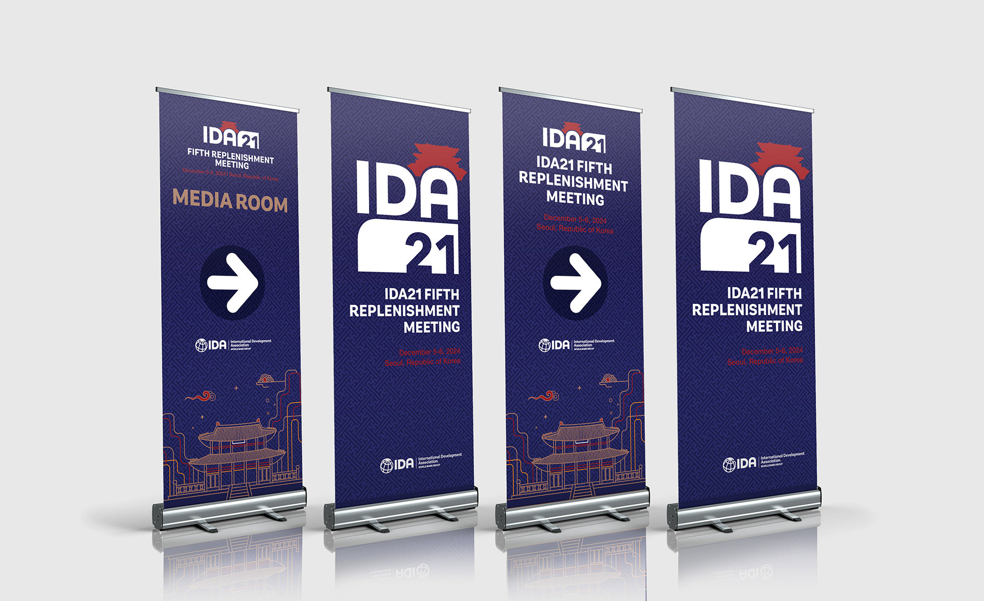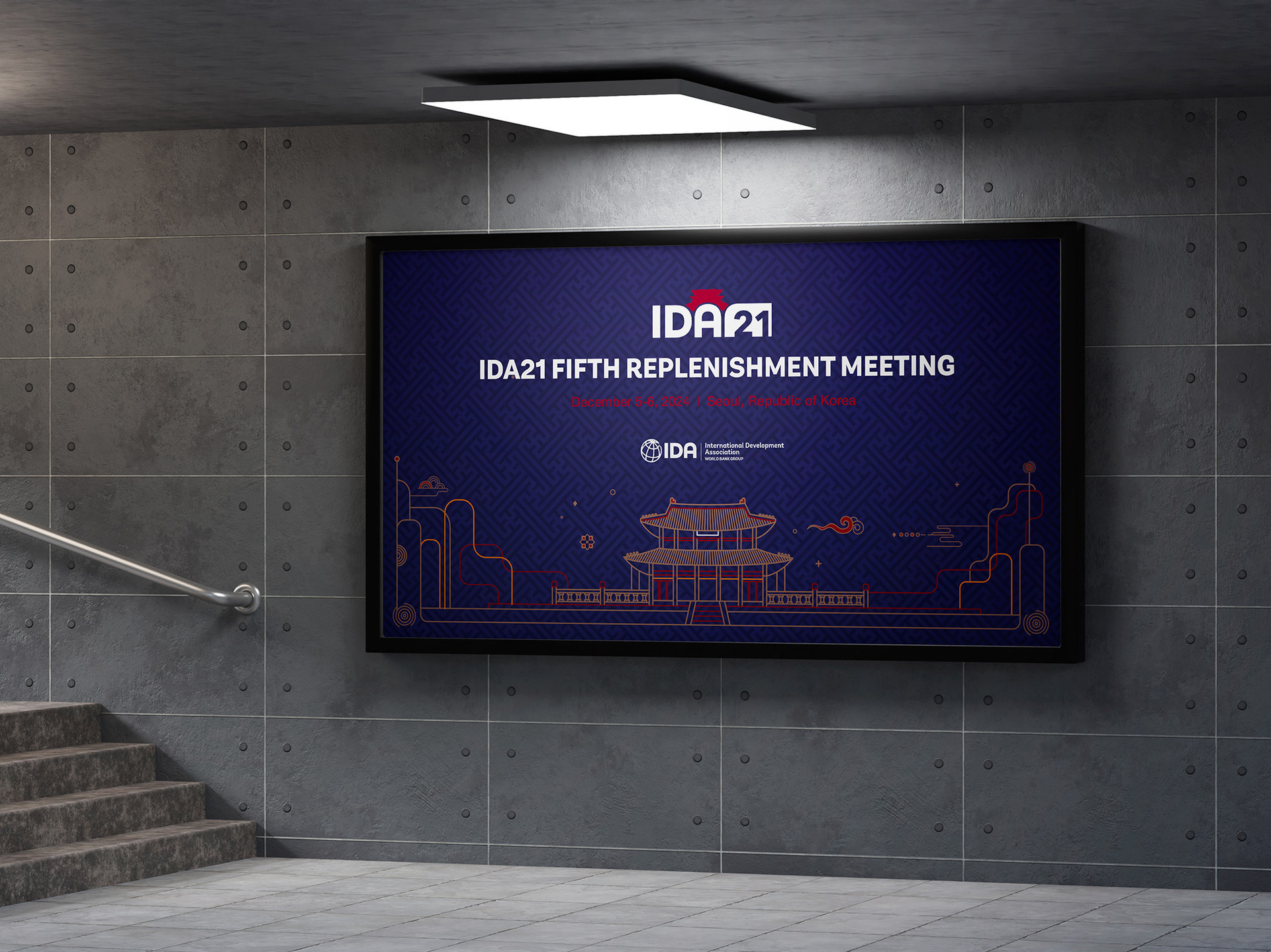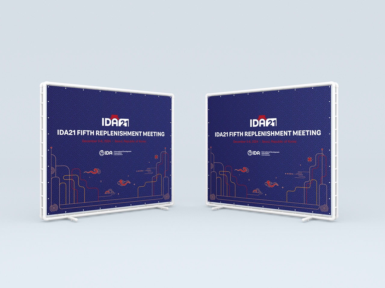 남색과 붉은색의 전통적인 색감의 배경과 라인의 조화는 국제개발협회의 비전인 조화로운 발전과 협력을 상징적으로 표현합니다.